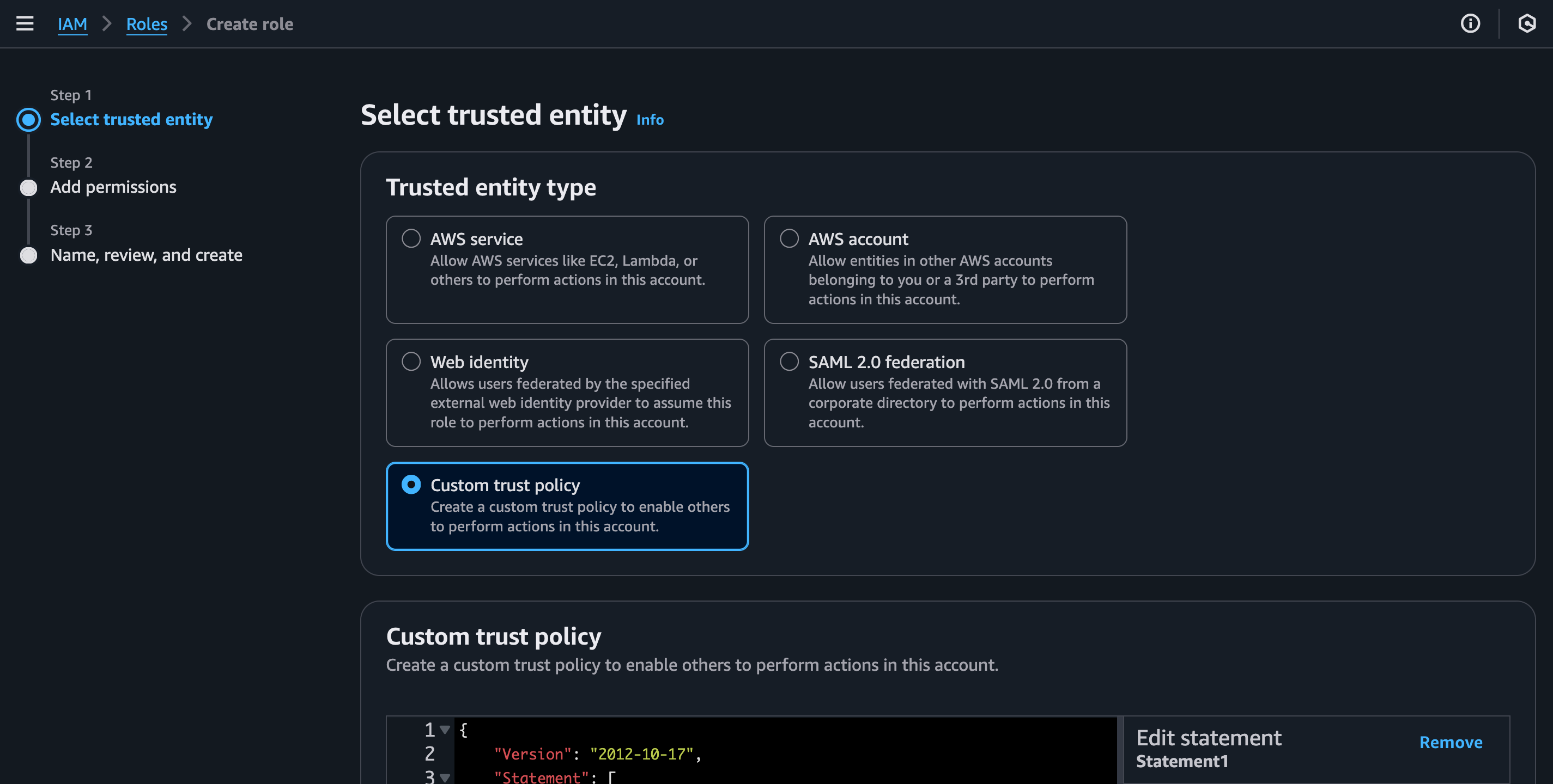 - Select "Custom trust policy" as "Trusted entity type" and copy the policy from the instructions, click the "Next" button